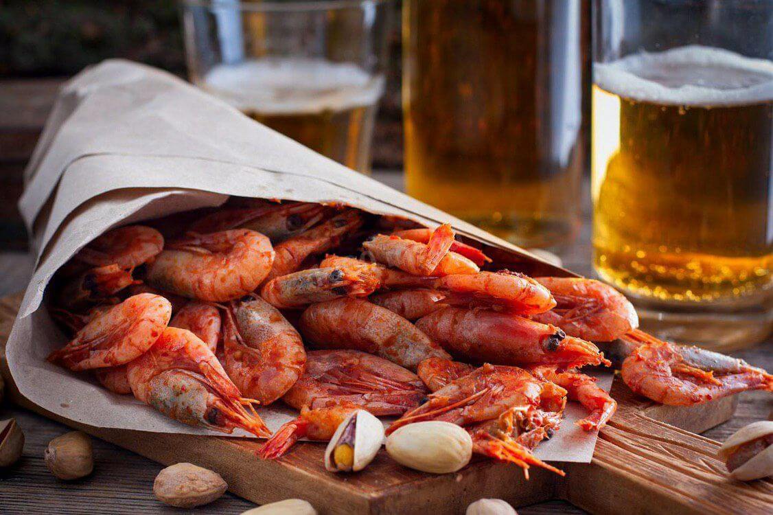 Из морепродуктов, предпочтение стоит отдать креветкам и мидиям. Прежде, чем начать коптить, их следует замариновать на сутки в рассоле. После обсушить от лишней влаги и можно начинать коптить до полу часа. Они обретают золотистую корочку. По готовности, можно обдать оливковым маслом и посыпать зеленью.