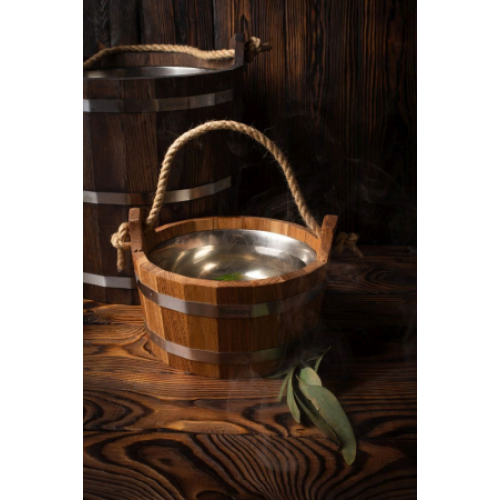 По всей окружности сделана клёпка, которая имеет толщину 15 мм с двумя или тремя обжимными кольцами из нержавеющей стали. Благодаря этому, шайка сохраняет форму и полностью исключает возможность протекания ёмкости. Вода сохраняет свою температуру гораздо дольше, а уход и очистка такого изделия гораздо проще, чем для моделей без вставки.