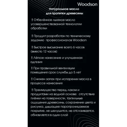 Натуральное масло усовершенствованной технологии обработки предназначено для защиты древесины в бане и других помещений с повышенной влажностью. Отбелённое масло разработано по требованию профессионалов Woodson, имеет лёгкое нанесение и лучшее проникновение в слои дерева. Полное высыхание первого слоя достигается всего за 6 часов и имеет улучшенную адгезию по сравнению с лаком. Масло идеально подчёркивает текстуру древесины и образует матовую, приятную на ощупь поверхность.