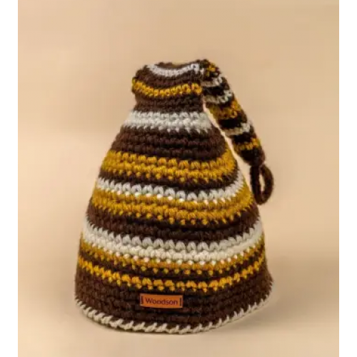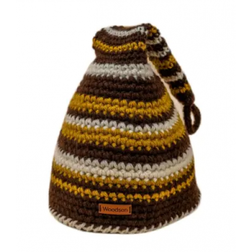 Шапка ручной работы с использованием толстой пряжи (3х нитка в два слоя) и орнаментом в оттенке: коричневый, молочный и тёмно-оранжевым. Изделие обеспечит защиту от перегрева головы в бане или сауне. Размеры шапки имеют 32 см в ширину и 47 см в высоту. Вязка достаточно плотная, а орнамент выдержан в цветовом решении ковриков Woodson. Шапки наилучшим образом поддаются стирке и сушке, не меняют размер после многократного использования. Шапка упакована во влагозащитную и премиальную упаковку.