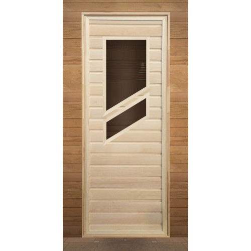 Дверь используется в качестве входной двери в парилку. Ассортимент деревянных дверей представлен большим количеством моделей как глухих так и со вставками из стекла. Изготавливаются из липы и осины хорошо показывающих себя при высокой влажности и температуре.