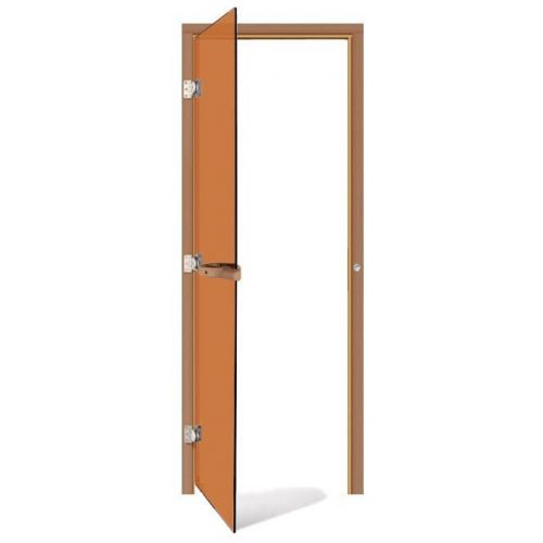 Данная модель двери подойдёт для установки в дверном проёме стандартных размеров. Стекло тонировано в благородный бронзовый оттенок. В комплект входит трёхсторонний короб и массивная удобная ручка из канадского кедра. Дверное полотно крепится на три хромированные петли. Петли находятся с правой стороны, что следует учитывать в планировке. Благодаря уплотнителю и магнитному фиксатору дверь надёжно закрывается и не пропускает потоков воздуха между помещениями. Выбор входной двери в парное помещение требует тщательного подхода. Как ни странно дверь выполняет множество важных функций: