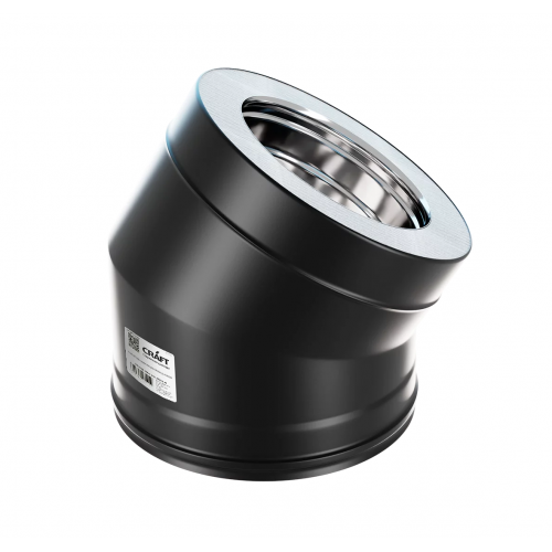 Элемент предназначен для изменения направления дымового канала и обхода препятствий во время монтажа. Внутренний контур изготовлен из коррозионностойкой нержавеющей стали AISI 316L толщиной 0,8 мм. Внешний контур выполнен из аустенитной стали AISI 430 толщиной 0,5 мм, окрашен матовой черной термостойкой эмалью, что исключает появление следов побежалости. Теплоизоляция выполнена из керамического волокна, это позволяет свести к минимуму образование конденсата и будет способствовать быстрому прогреву дымоходного канала и выходу системы в рабочий режим. Холодная формовка раструбного соединения с идеальной геометрией и газоплотностью. Лазерная сварка встык обеспечивает тонкий и прочный шов, увеличивая в разы срок эксплуатации. Рабочая температура до 600°С.
