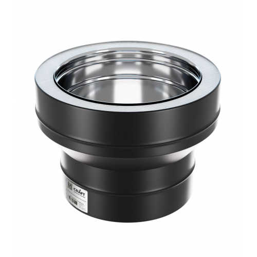Элемент дымоходного канала для перехода с одностенных элементов на двустенные утепленные. Внутренний контур изготовлен из коррозионностойкой нержавеющей стали AISI 316L толщиной 0,8 мм. Внешний контур выполнен из аустенитной стали AISI 430 толщиной 0,5 мм, окрашен матовой черной термостойкой эмалью, что исключает появление следов побежалости. Теплоизоляция выполнена из керамического волокна, это позволяет свести к минимуму образование конденсата и будет способствовать быстрому прогреву дымоходного канала и выходу системы в рабочий режим. Холодная формовка раструбного соединения с идеальной геометрией и газоплотностью. Лазерная сварка встык обеспечивает тонкий и прочный шов, увеличивая в разы срок эксплуатации. Рабочая температура до 600°С.