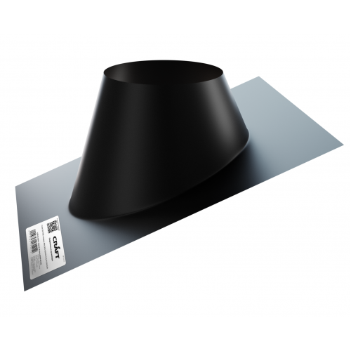Элемент предназначен для прохода дымохода через крышу. Плоская часть крышной разделки изготавливается из алюминия. Конусная часть изготавливается из коррозионностойкой нержавеющей стали AISI 304. Толщина стенки 0,5 мм. Окрашен в черный матовый цвет термостойкой эмалью