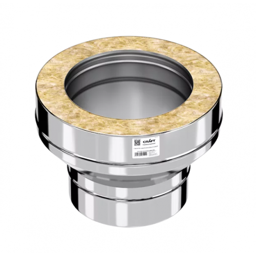 Элемент дымоходного канала для перехода с одностенных элементов на двустенные утепленные. Внутренний контур изготовлен из коррозионностойкой нержавеющей стали AISI 316L толщиной 0,8 мм. Внешний контур выполнен из аустенитной стали AISI 304 толщиной 0,5 мм. Теплоизоляция в верхней части элемента выполнена из базальтовой ваты. Холодная формовка раструбного соединения с идеальной геометрией и газоплотностью. Лазерная сварка встык обеспечивает тонкий и прочный шов, увеличивая в разы срок эксплуатации. Рабочая температура до 600°С.
