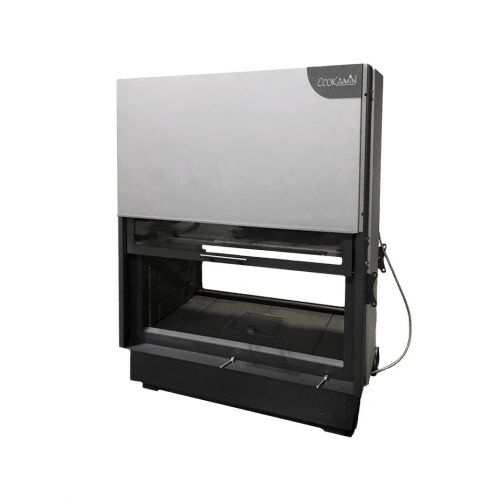 Ребра жесткости по всему корпусу топки и встроенные в дымосборник тепловые каналы позволяют снимать больше тепла и отдавать его в помещение путем конвекции. Высокий дымосборник и пламярассекатель не позволяют дымовым газам попадать в помещение при открывании дверцы. Бесшумная и надежная тросовая система с противовесом и жаропрочными подшипниками, позволяет открывать дверцу топки вверх и производить закладку дров в топочную камеру. Для оптимизации процессов горения все регулировки подачи воздуха на систему первичное горение, систему очистки стекла и встроенную шиберную заслонку производятся специальным ключом «ХОЛОДНАЯ РУКА». Под чугунной колосниковой решеткой в днище топки, находится большой зольный ящик, который удобно вынимается. Устойчивые, регулируемые по высоте ножки, позволяют при монтаже установить топку по уровню.