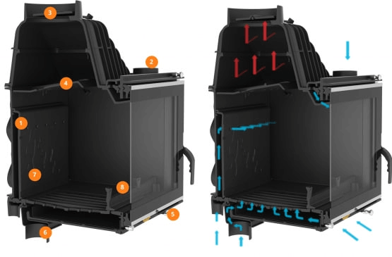 - Система дожигания газов увеличивает КПД топки и делает её экологичной.
