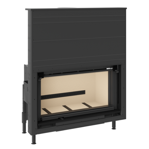 Дверца топки оборудована подъемным гильотинным механизмом, допускает использование камина с открытой дверкой. Дополнительно может комплектоваться электрической системой дистанционного подъема двери.