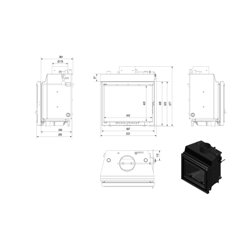 - Размеры топки (ВxШxД, мм) 677x633x364