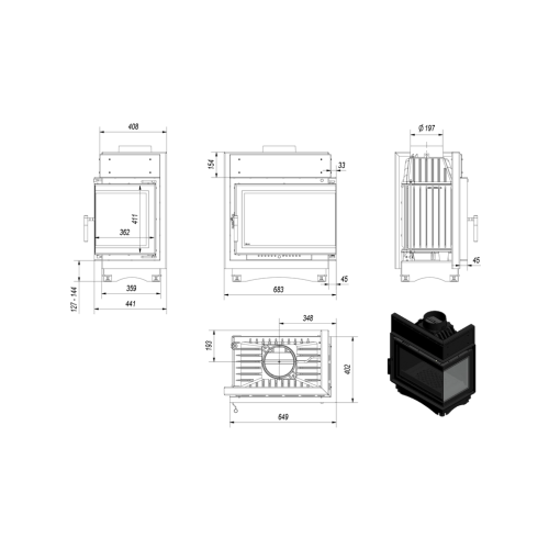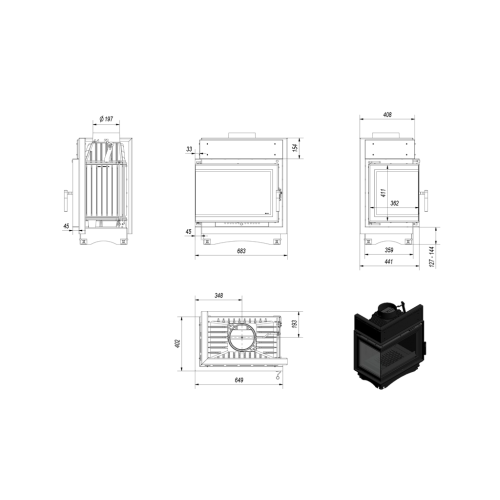 - Размеры топки (ВxШxД, мм) 827x683x408