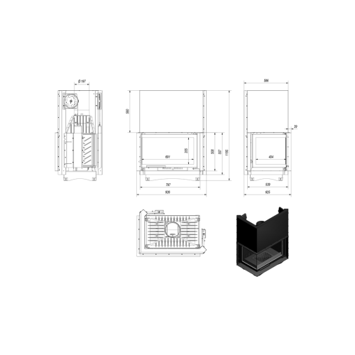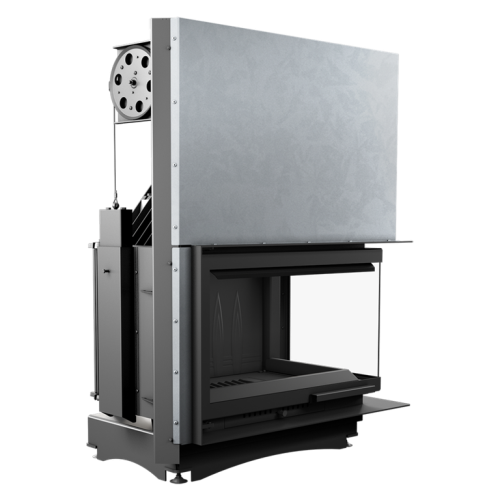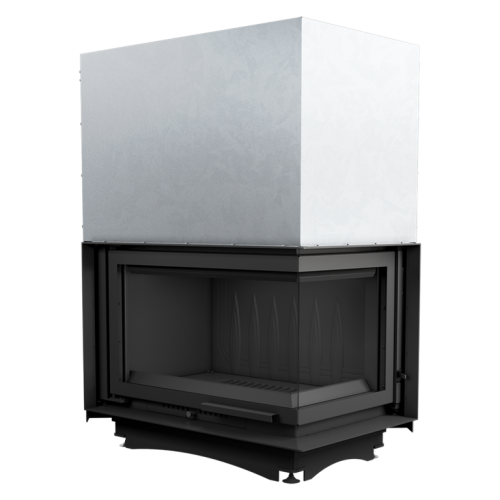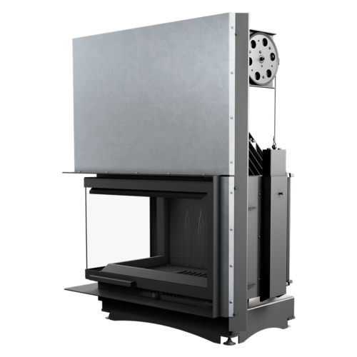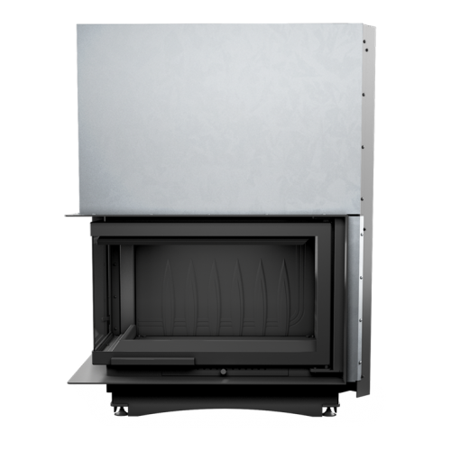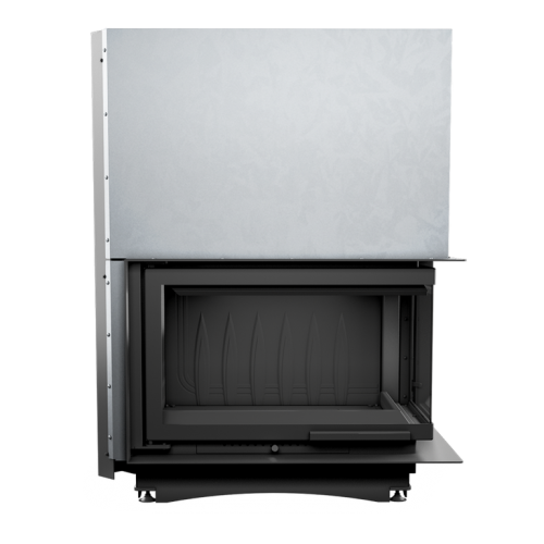 Закрытая топка с Г-образным стеклом Oliwia/P/BS/G выполнена из чугуна (дверца и топочная камера) и котловой стали (верхняя часть, скрывающая гильотинный механизм). Топка имеет верхнее подключение к дымоходу и оснащена прямым окном с угловым стеклом, выдерживающим нагрев в 800 градусов Цельсия. У топки гильотинный механизм открытия дверки вверх.