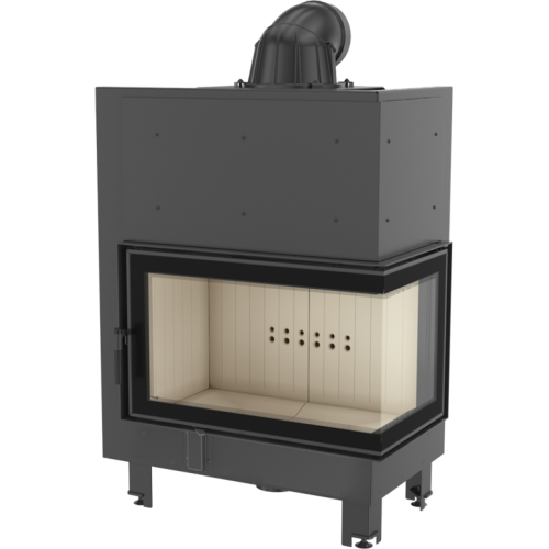 Корпус каминной топки изготовлен из котловой высоколегированной стали толщиной 4 мм, способной работать при повышенных температурах. Внутри камера сгорания футерована керамикой Acumotte, которая аккумулирует тепло, повышает температуру, способствует улучшению параметров горения и защищает стальной корпус. Жаропрочная стеклокерамика с дополнительным трафаретированием окантовки (glass system) придает камину современный дизайн и визуально увеличивает переднюю часть рамки. Стекло цельногнутое и выдерживает температуру до 800°C. Удобная регулировка подачи воздуха в камеру сгорания. Патрубок подачи воздуха находится внизу топки, имеет цилиндрическую форму. Это дает возможность присоединения трубы 125 мм с подачей свежего воздуха с улицы или другого помещения. Топка имеет тройную систему подачи воздуха в камеру сгорания. Первичный воздух подается по всей ширине топки через щель в полосе, расположенной на передней части камина. Подача вторичного воздуха в камеру сгорания осуществляется через отверстие под задней стенкой, за счет этого получаем снижение выбросов вредных веществ в окружающую среду. Данная система дожига газов повышает эффективность топки. Третья подача воздуха — это воздушная завеса, называется системой чистого стекла. Воздух подается с помощью специальных каналов по бокам топки и равномерно распределяется на стекло по всей ширине. Патрубок дымохода чугунный поворотный с возможностью регулировки на 360 градусов.