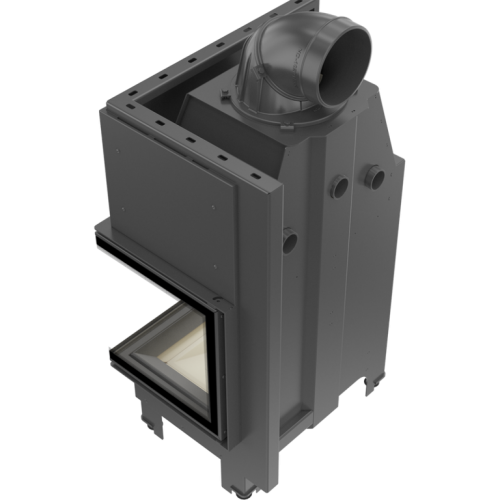 Удобная регулировка подачи воздуха в камеру сгорания. Патрубок подачи воздуха находится внизу топки, имеет цилиндрическую форму. Это дает возможность присоединения трубы 125 мм с подачей свежего воздуха с улицы или другого помещения. Топка имеет тройную систему подачи воздуха в камеру сгорания. Первичный воздух подается по всей ширине топки через щель в полосе, расположенной на передней части камина. Подача вторичного воздуха в камеру сгорания осуществляется через отверстие под задней стенкой, за счет этого получаем снижение выбросов вредных веществ в окружающую среду. Данная система дожига газов повышает эффективность топки. Третья подача воздуха — это воздушная завеса, называется системой чистого стекла. Воздух подается с помощью специальных каналов по бокам топки и равномерно распределяется на стекло по всей ширине.