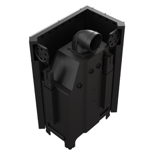 Корпус топки и ее передняя часть изготовлены из высоколегированной стали. Патрубок дымохода поворотный, двухсоставной и с возможностью регулировки на 360 градусов. Конструкция дымосборника, с системой горизонтальных теплоотводящих труб, увеличивает передачу тепла от нагреваемой поверхности в помещение. Дефлектор увеличивает путь дымовых газов, обеспечивая более экологичное сгорание.