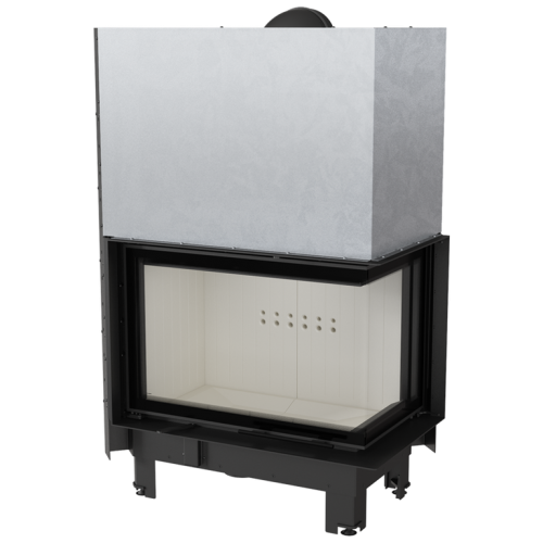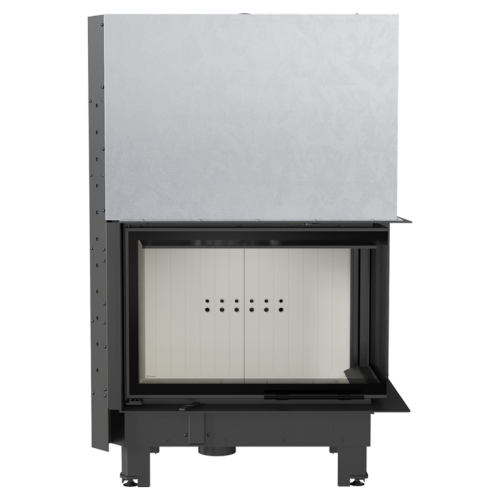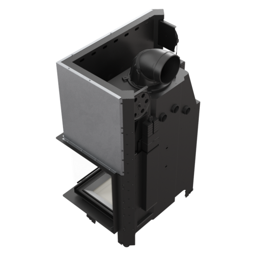 Корпус топки и ее передняя часть изготовлены из высоколегированной стали. Патрубок дымохода поворотный, двухсоставной и с возможностью регулировки на 360 градусов. Конструкция дымосборника, с системой горизонтальных теплоотводящих труб, увеличивает передачу тепла от нагреваемой поверхности в помещение. Дефлектор увеличивает путь дымовых газов, обеспечивая более экологичное сгорание. Топка оснащена одинарным ЦЕЛЬНОГНУТЫМ декоративным стеклом с подъемным механизмом дверцы. Камера сгорания выложена керамическим материалом Acumotte, который повышает температуру в камере, что способствует улучшению параметров сгорания. Дверка выполнена из закрытого профиля, что делает ее более устойчивой и стабильной к нагрузкам во время работы при высоких температурах. Ножки топки выполнены с возможностью регулировки по высоте. Патрубок подачи наружного воздуха диаметром 125 мм имеет заслонку для регулировки интенсивности подачи воздуха в камеру сгорания.