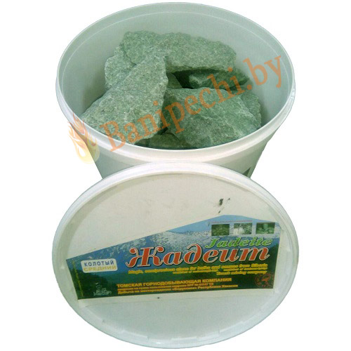 Камни для бани "Жадеит" - минерал зелёного цвета из группы щелочных моноклинных пироксенов, силикат натрия и алюминия. Жадеит оказывает благоприятное энергетическое воздействие на организм человека: нормализует артериальное давление, укрепляет нервную систему, улучшает состав крови, смягчает кровеносные сосуды, усиливает мужскую потенцию, лечит заболевания мочевыводящих путей, почек. У разогретого жадеита полезные свойства усиливаются. При нагревании Жадеит выделяет ионы натрия и ряда микроэлементов (Zn, Cu, Se, Ag и др., всего около 60-ти), которые попадают в кровоток вместе с вдыхаемым воздухом, а также всасываясь через кожу. Достигая центров коры головного мозга, ионы нормализируют состояние вегетативной и центральной нервной системы, функции эндокринных желез, а также создают противовоспалительный эффект и бактериостатическое действе.