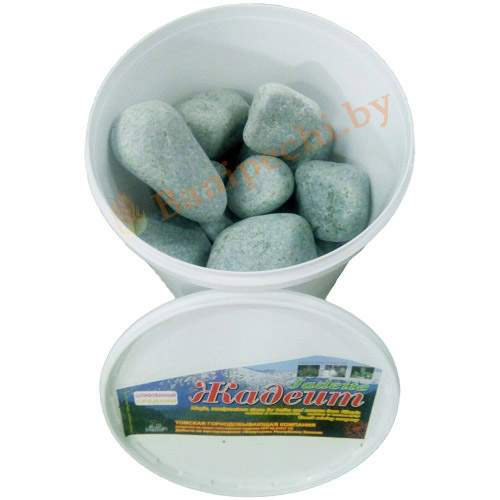 Камни для бани "Жадеит" - минерал зелёного цвета из группы щелочных моноклинных пироксенов, силикат натрия и алюминия. Жадеит оказывает благоприятное энергетическое воздействие на организм человека: нормализует артериальное давление, укрепляет нервную систему, улучшает состав крови, смягчает кровеносные сосуды, усиливает мужскую потенцию, лечит заболевания мочевыводящих путей, почек. У разогретого жадеита полезные свойства усиливаются. При нагревании Жадеит выделяет ионы натрия и ряда микроэлементов (Zn, Cu, Se, Ag и др., всего около 60-ти), которые попадают в кровоток вместе с вдыхаемым воздухом, а также всасываясь через кожу. Достигая центров коры головного мозга, ионы нормализируют состояние вегетативной и центральной нервной системы, функции эндокринных желез, а также создают противовоспалительный эффект и бактериостатическое действе.