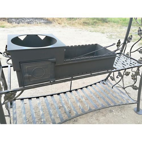 В жаровне, спереди, предусмотрена чугунная топочная дверь, для "подкидывания" дров, на мангале можно одновременно готовить шашлык и любимое блюда в казане.