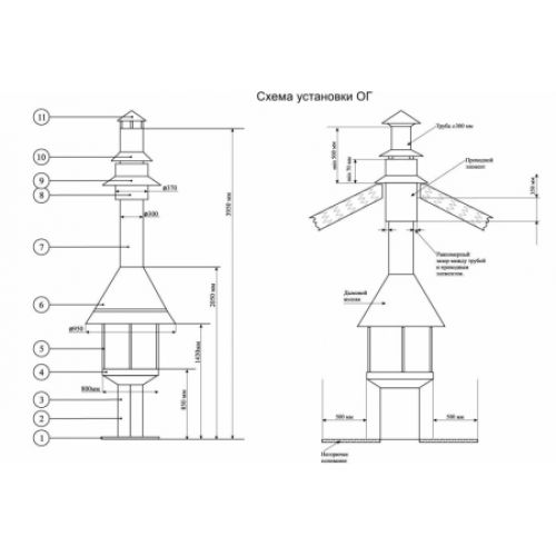 Элементы 7, 8, 9, 10 поставляются в комплектации для установки очага под крышей.
