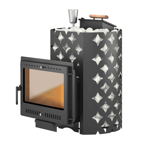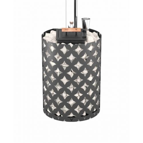 Для устройства наружной открытой каменки печь ЭТНА ЗК 18 Панорама М оснащается металлическим кожухом с прорезным рисунком оригинального дизайна. Пространство между печью и кожухом из двухмиллиметровой стали заполняется камнями для бани, которые выполняют роль теплонакопителя, перераспределяют тепло от стенок топки и защищают парящихся от жёсткого инфракрасного излучения. Воду подают на нагретые камни, с которых полученный пар распространяется по всему объёму парной. Кожух диаметром 620 миллиметров вмещает в себя до 130 килограммов камней крупной и средней фракции.