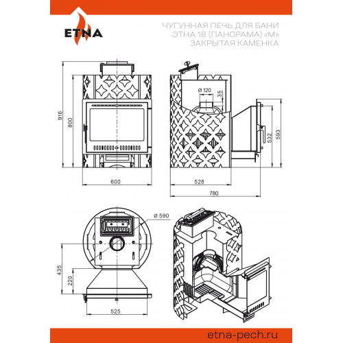 Банная печь ЭТНА ЗК 18 Панорама М изготовлена из чугуна высокого качества. Материал с высокой теплопроводностью, чугун быстро передаёт энергию сжигаемого топлива наружу, в пространство парной. Толщина деталей корпуса составляет 6-8 миллиметров.