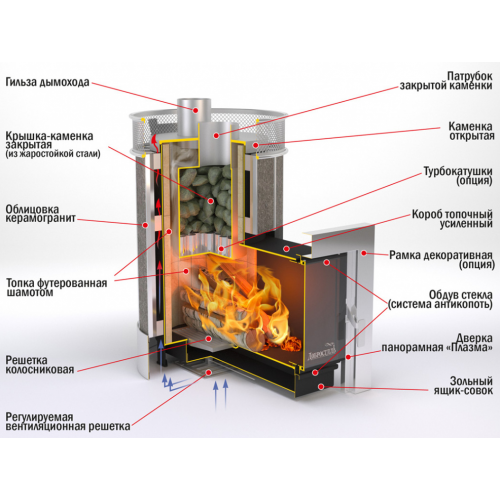 Облицовка - это не только стильный дизайн, но еще и функциональные возможности. Она выполняет роль конвективной системы и экранирует мощное инфракрасное излучение от корпуса топки, распределяя более комфортное тепло в атмосферу парной.
