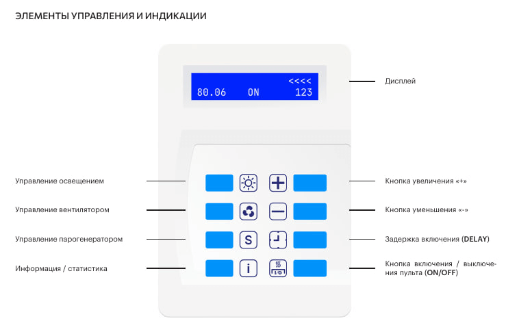 Отложенный запуск и регулировка продолжительности работы позволят подготовить сауну к использованию к вашему приезду или пробуждению, управление яркостью освещения поможет создать особый уют в парильне, регулировка вентиляции позволит контролировать «тяжесть» воздуха в сауне. Панель оснащена выносным силовым блоком.