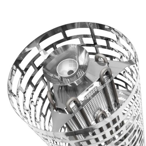 Все корпусные элементы печи выполнены из нержавеющей стали. Вес загружаемых камней составляет 100кг, что сопоставимо с загрузкой камней в хорошей дровяной печи. Нагревательный элемент - ТЭН диаметром 10мм. В итоге с помощью парогенератора, закрытой каменки и большой закладки камня, легко достигается режим настоящей русской бани.