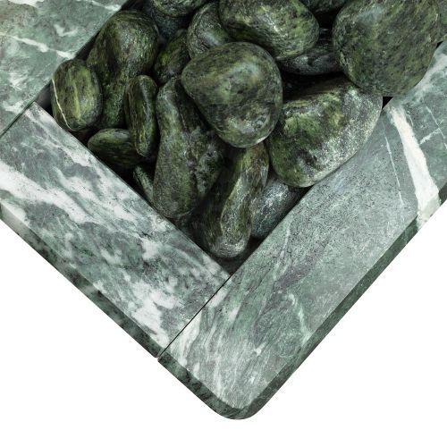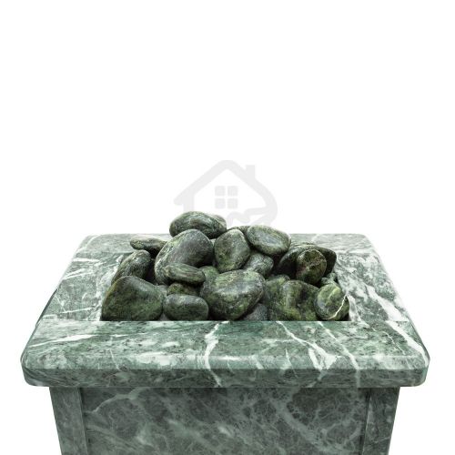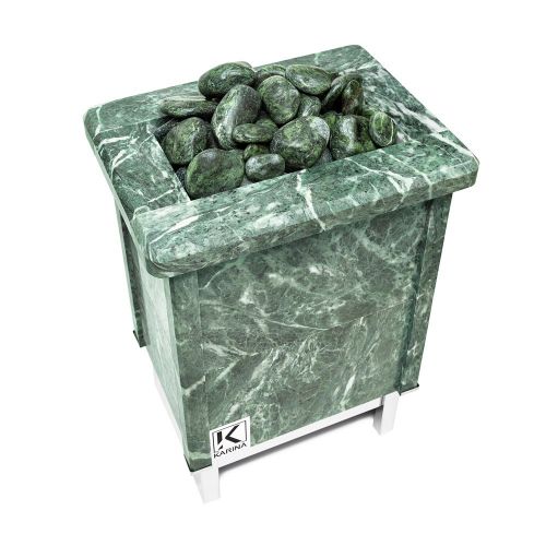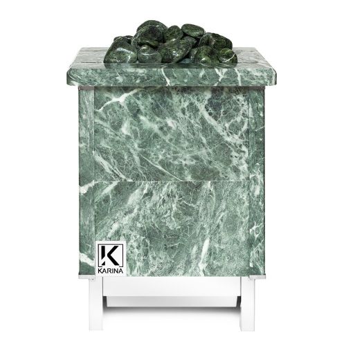 Электрическая каменка со всех сторон облицована натуральным змеевиком. Печь с подобным дизайном стильно смотрится в парильном помещении. Змеевик уже долгие годы используется для внутренней отделки бань. Его называют «аптекарским камнем» за его целебные качества. Минерал оказывает обеззараживающий эффект, положительно влияет на кости, оказывает успокаивающее воздействие и укрепляет иммунитет.
