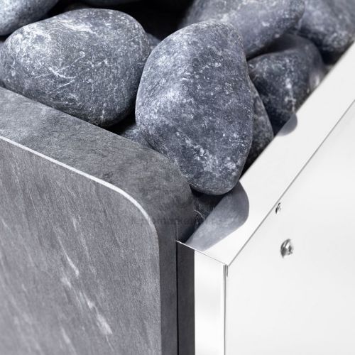 Простые формы каменки выгодно подчеркнуты 4 вертикальными камнями талькохлорита, которыми облицованы передняя и задняя стенки печи. Материал боковых стенок представляет собой высококачественная нержавеющая сталь, защищающая все внутренние элементы прибора от влаги, температурных перепадов и коррозии.