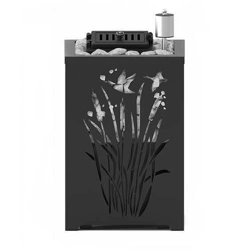 Конвекционный кожух для печей Эверест INOX заменяет каменную или кирпичную обкладку печи INOX и позволяет сократить время на оборудование парной. Кожух обеспечивает хорошую конвекцию в парной и быстрый прогрев помещения. Стенки кожуха выполнены в виде прорезного щелевого узора в виде зарослей камыша. Прорезы расположены равномерно по всей высоте стенки. За счёт выхода воздуха по всей длине стенок такие прорезы обеспечивают более быстрый прогрев парной. Конвекционные возможности кожуха с узором «Камыш» меньше, чем у кожуха с узором «Горы». Кожух состоит из четырёх стенок и верхнего обода. Стенки собираются на винтах и устанавливаются по периметру печи. Квадратный обод сверху закрывает кожух и придаёт изделию законченный внешний вид. Кожух изготовлен из конструкционной стали толщиной 3 мм, легко выдерживает термические и механические нагрузки. Он защищает печь от внешних воздействий и делает эксплуатацию печи более безопасной. Печи Эверест INOX в модификации с кожухом обеспечивают активное движение воздуха и быстрый прогрев помещения парной. Щель между кожухом и стенкой печи является хорошим конвектором. Кожух в сборе чуть выше самой печи, что позволяет организовать на верхней части печи дополнительную открытую каменку (вмещает от 15 до 25 кг камней, в зависимости от фракции камня), на которую во время парения можно поддавать воду для получения высокой влажности в парной.