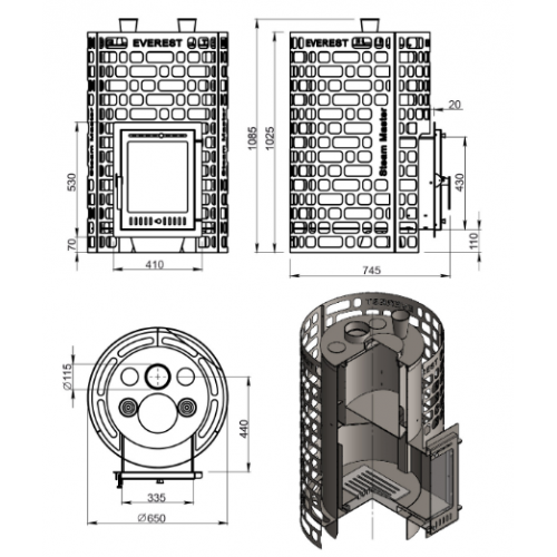 Внешний тепловой контур образован открытой каменкой в виде цилиндрической сетки, вмещающей в себя 170 килограммов камней. Сетка сделана из стали, в новом минималистичном дизайне EVEREST.