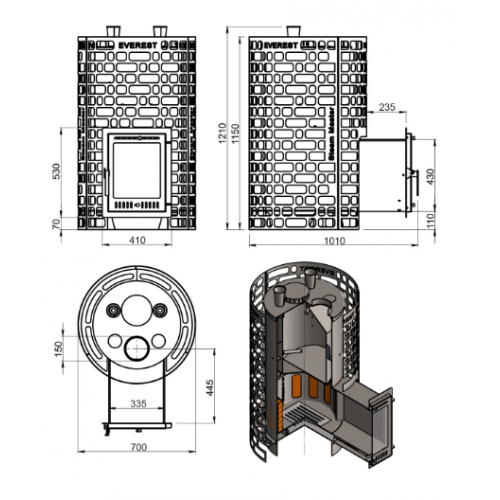 Внешний тепловой контур образован открытой каменкой в виде цилиндрической сетки, вмещающей в себя 235 килограммов камней. Сетка сделана из стали, в новом минималистичном дизайне EVEREST.