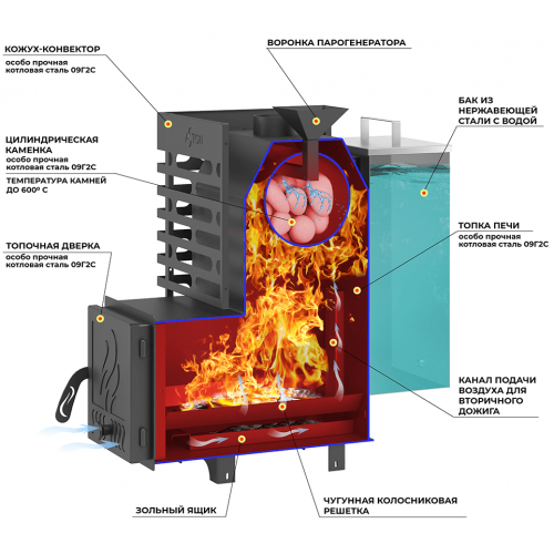 - Глубокая невентилируемая каменка-труба из стали 09Г2С толщиной 4 мм прогревается открытым пламенем для максимального нагрева камней, заложенных в нее и выполняет роль пламегасителя.