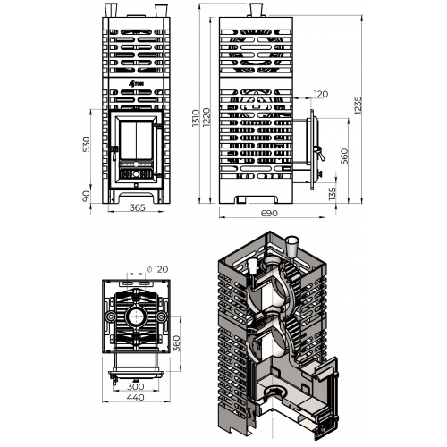 Чугунная печь Астон Шторм 18 состоит из двух вертикальных полукорпусов, соединяющихся на болтах. Система соединения паз-гребень обеспечивает герметичность топочной камеры даже при сильном длительном нагреве печи. Качественный чугун позволяет накапливать много энергии от горения дров и быстро передавать её камням, размещённым внутри печи и в сетке вокруг теплового агрегата.