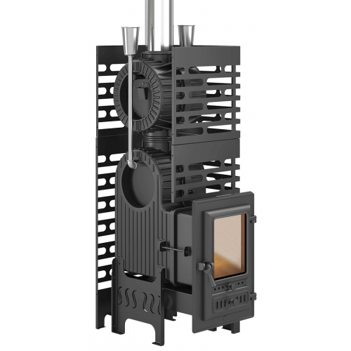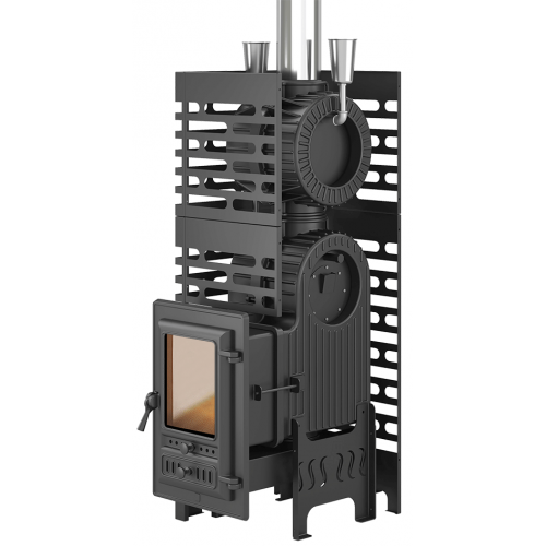 Комплект состоит из чугунной банной печи Астон Шторм 18 и чугунной натрубной каменки Турбопар. Объединение двух конструкций в единую систему заметно увеличивает тепловую отдачу термоагрегата, предотвращает перегрев дымохода, организует дополнительную каменку для получения качественного пара.