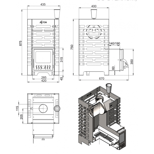 - Линейка печей ASTON из нержавеющей стали рассчитана на установку в парные объёмом от 6 до 22 м3.