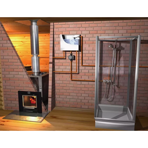 В помещении бак-теплообменник устанавливают над топкой на стартовую трубу дымохода. При монтаже можно использовать только металлическую подводку.