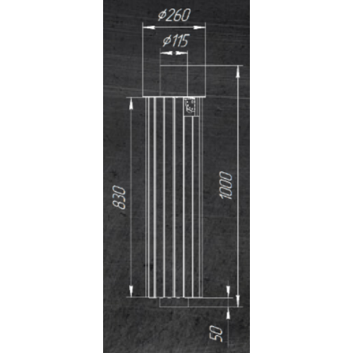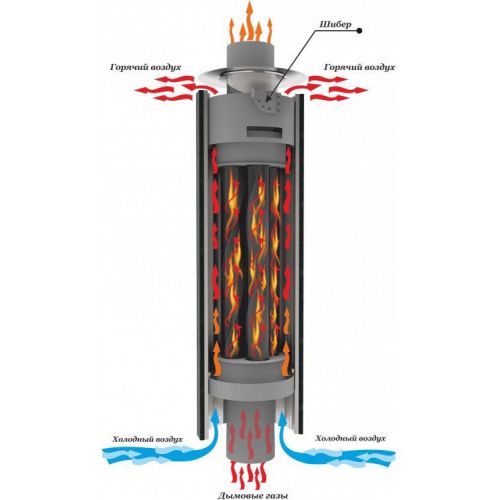 Корпус представляет собой трубу диаметром 115 мм. Материал изготовления — конструкционная сталь. Внутри основного канала дымохода установлены 4 трубы меньшего диаметра со спиралевидными рассекателями. После разведения огня в стартовой дымоход из печи попадают газы. Внутри канала «Экономайзера» газы разбиваются на 4 потока. Рассекатели замедляют движение раскаленных газов, заставляют потоки проходить вплотную к внутренним стенкам труб. За счет этого металлические поверхности быстрее нагреваются и сразу отдают тепло воздуху.