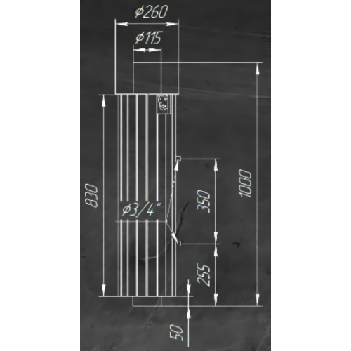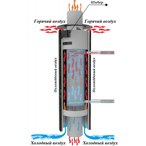 Встроенные каналы распределяют потоки воздуха, забирая холодный воздух в нижней части дымохода, нагревая его и отдавая в верхней части с помощью регулятора. В конструкцию дымохода встроен бак-теплообменник цилиндрической формы (объем — 2,8 литра) из жаропрочной нержавеющей стали толщиной 1 мм. Эффективно использует отходящее тепло от печи, нагревает воду и обеспечивает конвекцию воздуха в парильном помещении. Снабжен шибером, который предназначен для регулировки тяги и обеспечения процесса горения в печах. Надежно фиксируется в заданном положении.