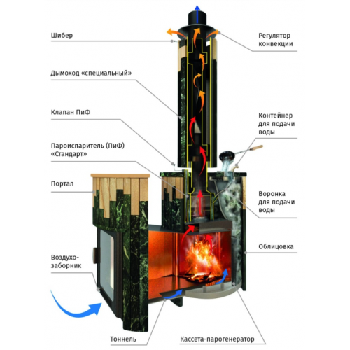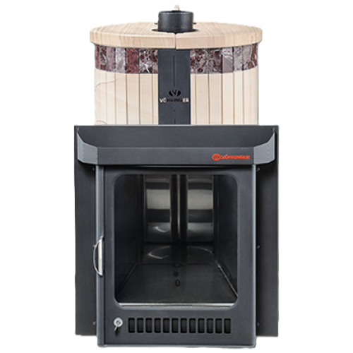 Печи VÖHRINGER с дровяной каменкой, у которой вся топка окружена большой массой камней, сильно разогревается, а дров уходит немного, благодаря полному сжиганию дымовых газов с помощью бокового и верхнего горения. Использование эффекта «Vortex», позволяет извлечь всю энергию и направить её на нагрев большого количества камней.