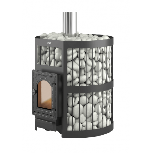 Для устройства наружной открытой каменки печь ЭТНА 24 оснащается металлическим кожухом с прорезным рисунком оригинального дизайна. Пространство между печью и кожухом из двухмиллиметровой стали заполняется камнями для бани, которые выполняют роль теплонакопителя, перераспределяют тепло от стенок топки и защищают парящихся от жёсткого инфракрасного излучения. Воду подают на нагретые камни, с которых полученный пар распространяется по всему объёму парной. Кожух диаметром 620 миллиметров вмещает в себя до 150 килограммов камней крупной и средней фракции.