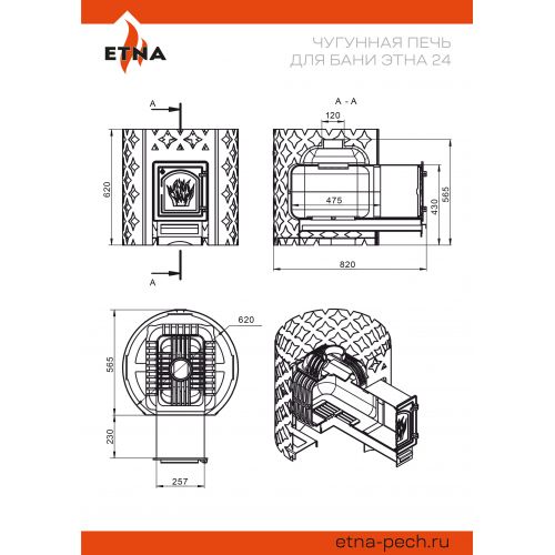 Банная печь ЭТНА ЗК 24 ДТ-4 изготовлена из чугуна высокого качества. Материал с высокой теплопроводностью, чугун быстро передаёт энергию сжигаемого топлива наружу, в пространство парной. Толщина деталей корпуса составляет 6-8 миллиметров.