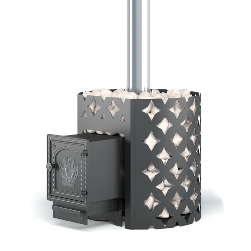 Для устройства наружной открытой каменки печь ЭТНА ЗК 24 оснащается металлическим кожухом с прорезным рисунком оригинального дизайна. Пространство между печью и кожухом из двухмиллиметровой стали заполняется камнями для бани, которые выполняют роль теплонакопителя, перераспределяют тепло от стенок топки и защищают парящихся от жёсткого инфракрасного излучения. Воду подают на нагретые камни, с которых полученный пар распространяется по всему объёму парной. Кожух диаметром 620 миллиметров вмещает в себя до 130 килограммов камней крупной и средней фракции.