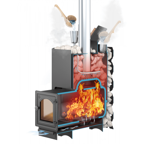 Пространство между печью и сеткой заполняется камнями для бани, которые выполняют роль теплонакопителя, перераспределяют тепло от стенок топки. Воду подают на нагретые камни, с которых полученный пар распространяется по всему объёму парной. Кожух диаметром 560 миллиметров вмещает в себя до 120 килограммов камней крупной и средней фракции.