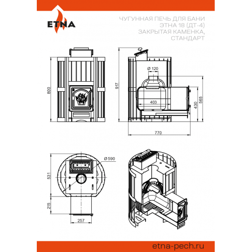 Чугунная банная печь ЭТНА 18 (ДТ-4С) оснащается чугунной дверкой ДТ-4С и рассчитана на работу в парной объёмом до 18 кубических метров. С помощью этой модели обеспечивается быстрый равномерный прогрев парной, поддержание необходимой температуры и получение достаточного количества пара.