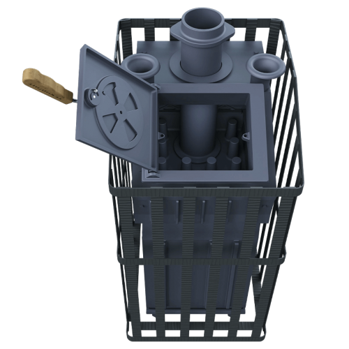 Основной принцип работы печи сохранён – получение пара с теплоёмкой каменки прямого нагрева. Каменка является сводом топки, нагревается с нижней поверхности снабженной теплосъемными шипами для увеличения контакта с пламенем.