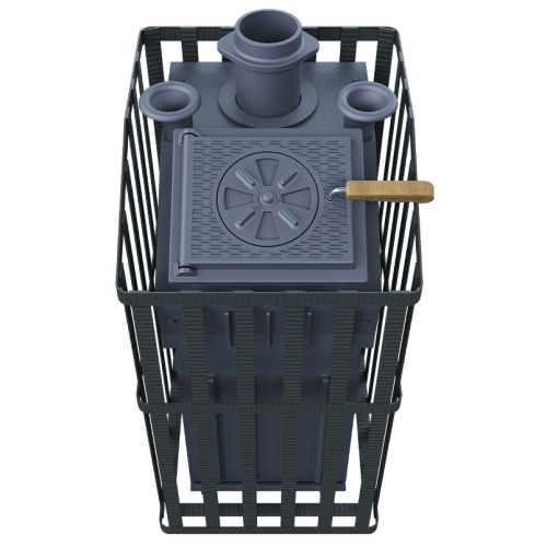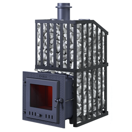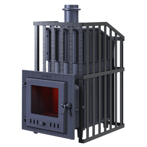 Печь для бани GROZA 24 (М) Ураган - расширенный комплект печи в сетке. Максимально приближенный вариант печи для режимов русской парной, имеющий непосредственно закрытую чугунным коробом каменку, дверцу для пара с ручкой из бука, увеличенную до 50см чугунную стартовую трубу.