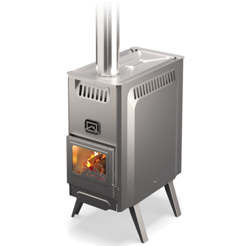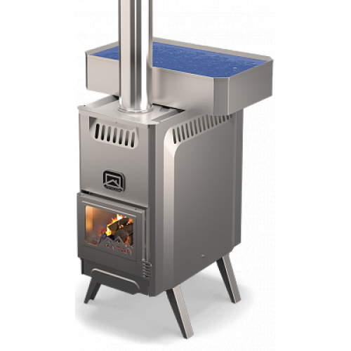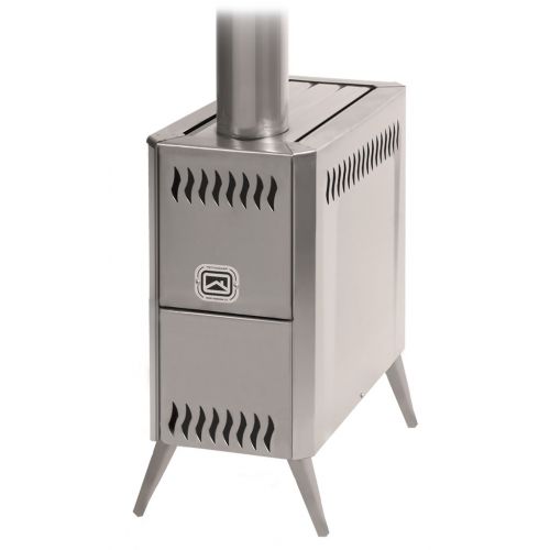 Портативная дровяная печь "Алтай". Топится дровами. Материал - нержавеющая жаростойкая сталь. Печь укомплектована парообразователем, использовать который можно после готовности печи (10-20 минут после розжига), дверцей со стеклом устойчивым к высокой температуре, разборным дымоходом и съемными ножками.